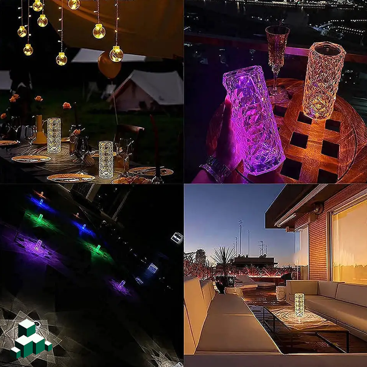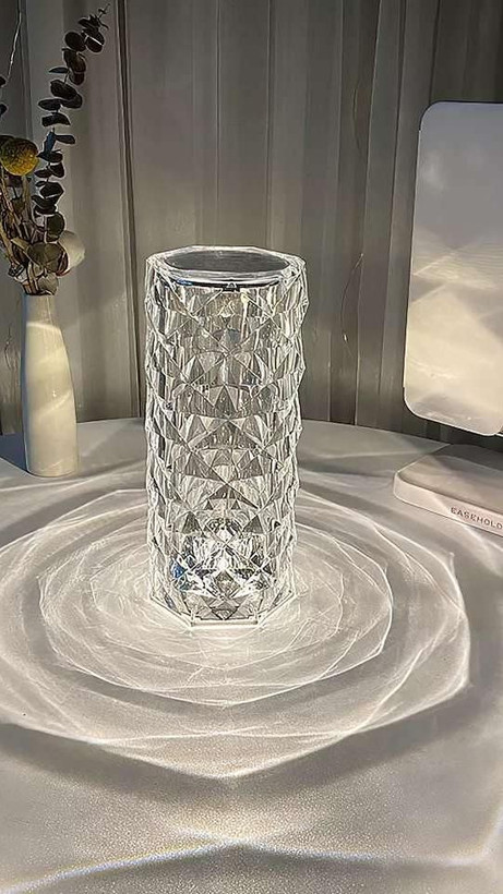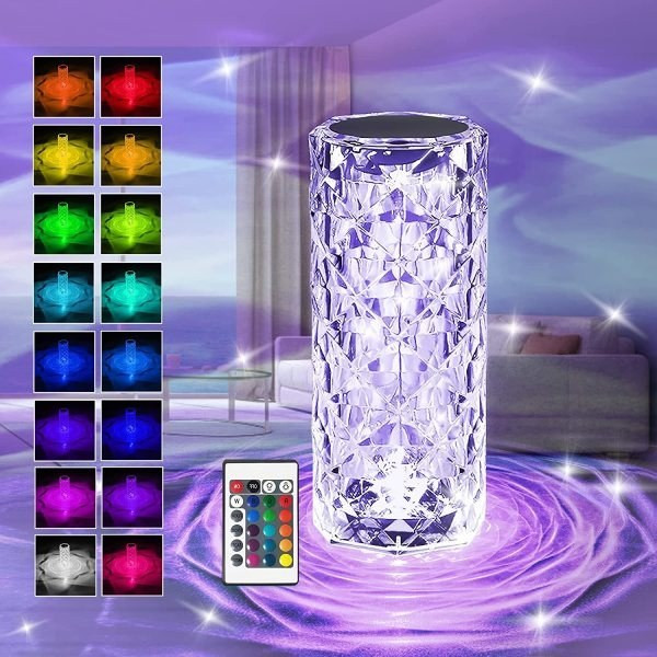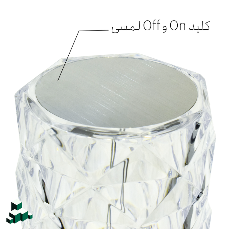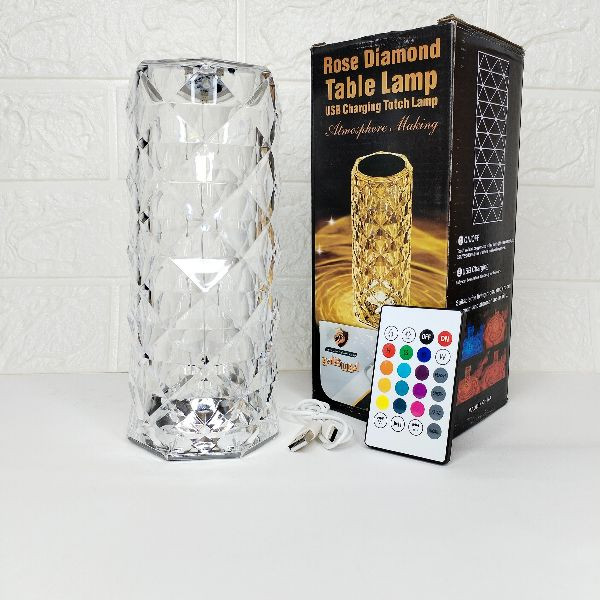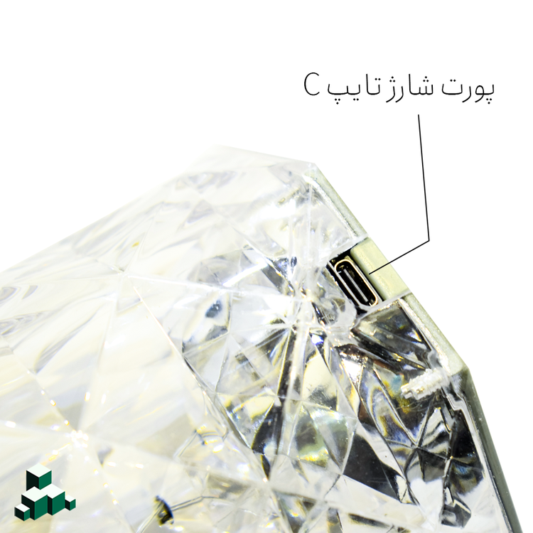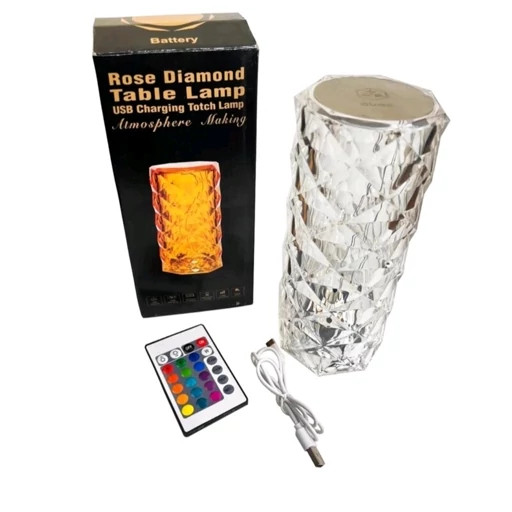 چراغ خواب کریستال رومیزی پلاستیک شفاف شارژی که برای شارژ کردن از کابل یو اس بی (تایپ سی ) استفاده میشود و برای خاموش و روشن کردن آن و نوع نورپردازی آن میتوان از کنترل راه دور استفاده کرد.