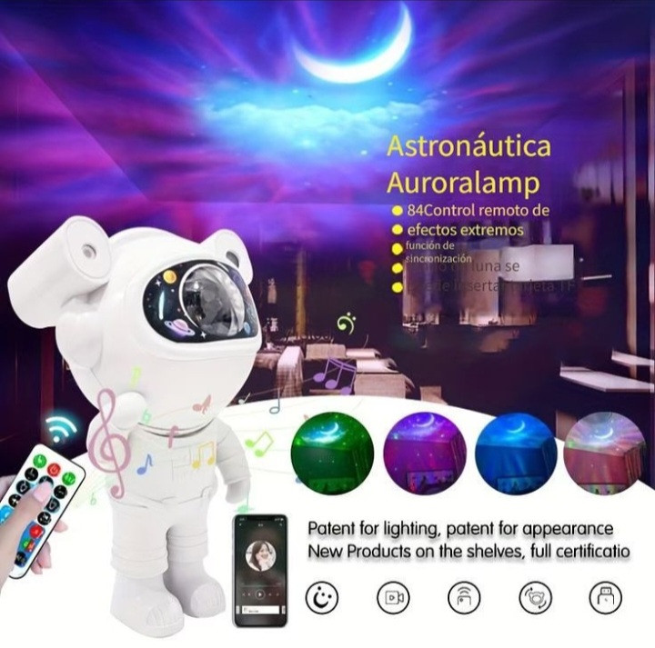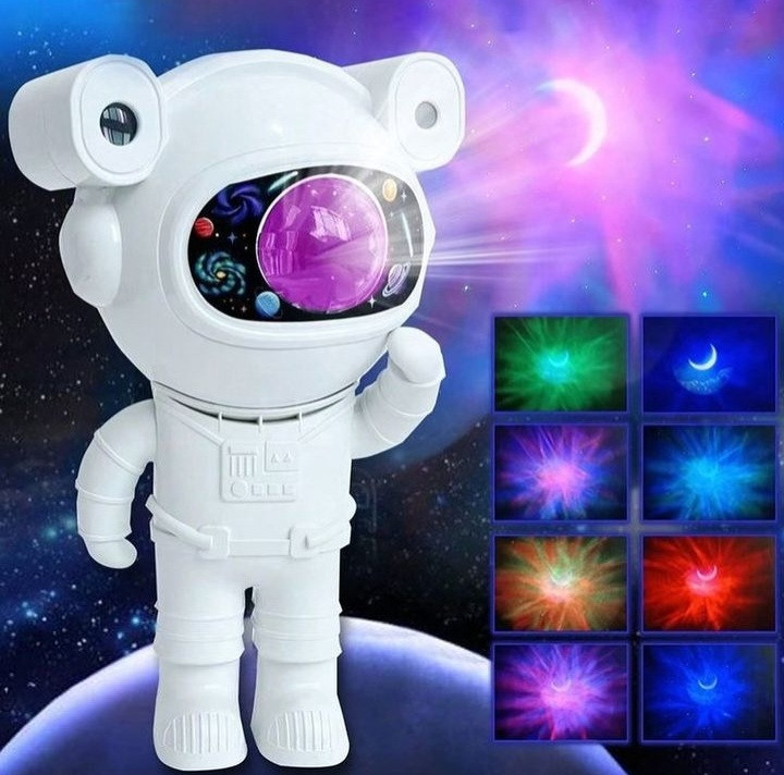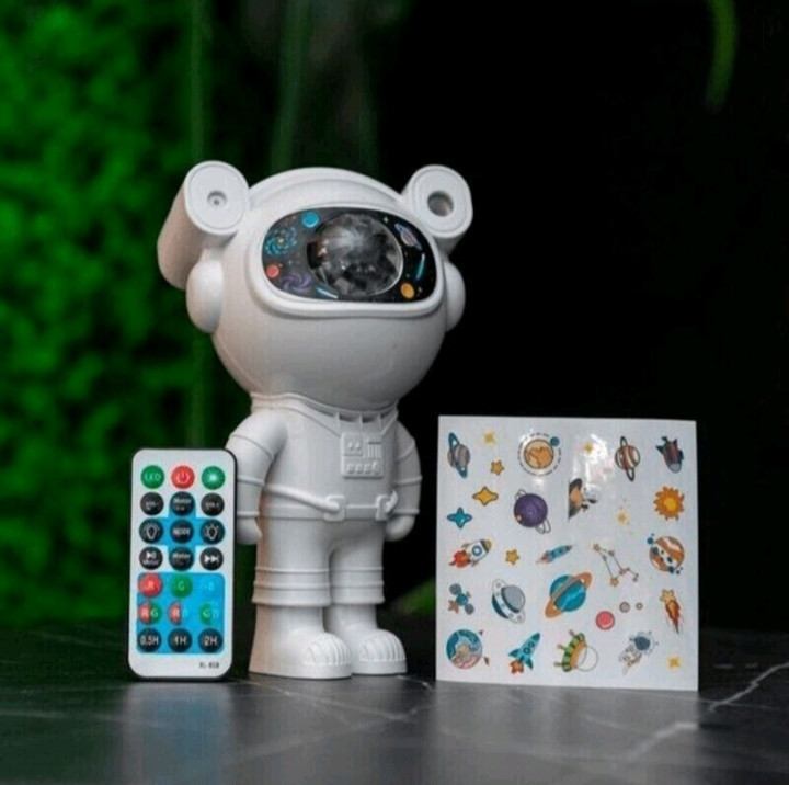 چراغ خواب کهکشانی طرح فضانورد یک چراغ خواب یا نورپردازی با قابلیت پخش افکت تصویر زنده کهکشانی در رنگ های مختلف به همراه لیزر ستاره ای بر روی سقف و دیوار اتاق یا هر سطح دیگری است که به همراه افکت لیزر ستاره ای حس یک سفر کهکشانی را قبل از خواب به شما میدهد .این پروژکتور کهکشانی دارای یک اسپیکر بلوتوثی در قسمت پایه زیرین نیز هست که میتواند برای شما هر موسیقی آرامش بخشی را پخش نمایید تا بتوانید با آرامش به خواب بروید برای روشن شدن بلوتوث اسپیکر دکمه کوچک روی پایه را فشار دهید تا روشن بشود . تلفیق همزمان تصویر زنده کهکشانی و لیزر ستاره ای و اسپیکر بلوتوثی جذابیت اتاق خواب و خواب شما را چندین برابر میکند . این محصول دارای ریموت کنترل نیز می باشد که میتواند نور پرژکتور یا لیزر را کم یا زیاد و یا برای روشن ماندن محصول تایمر تعریف کنید که سر ساعت مشخص شده محصول خاموش بشود . این محصول دارای باتری داخلی است و میتوانید بدون نیاز به اتصال دائم به برق از آن در هرجایی که دوست دارید استفاده کنید و لذت ببرید.