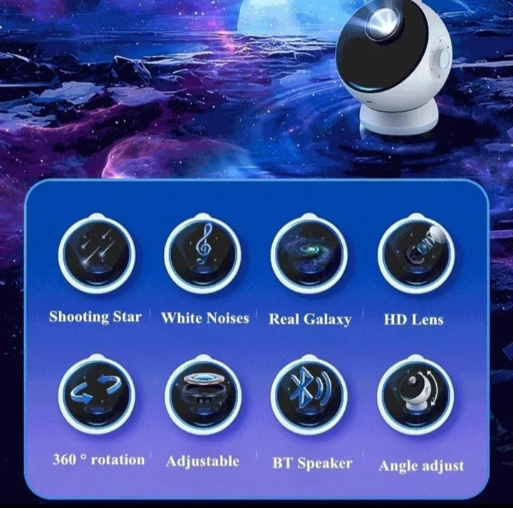 این پروژکتور فوق العاده با ارائه تصاویری واقع گرایانه و شگفت انگیز از زیبایی های آسمان، تجربه ای لذت بخش و آرامش بخش را به شما هدیه می دهد. همچنین با مجهز بودن به لنز HD تصاویری با کیفیت بالا و وضوح عالی را به نمایش می گذارد.