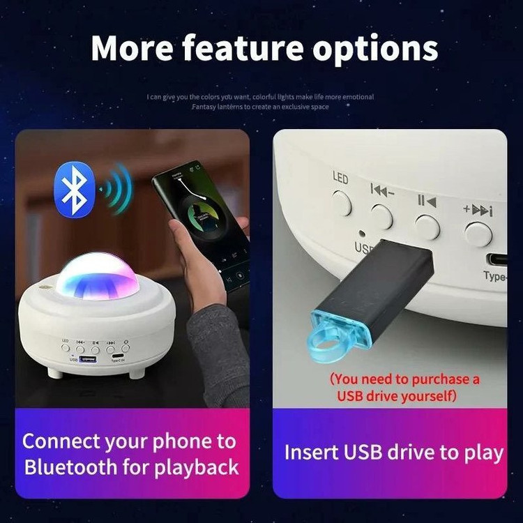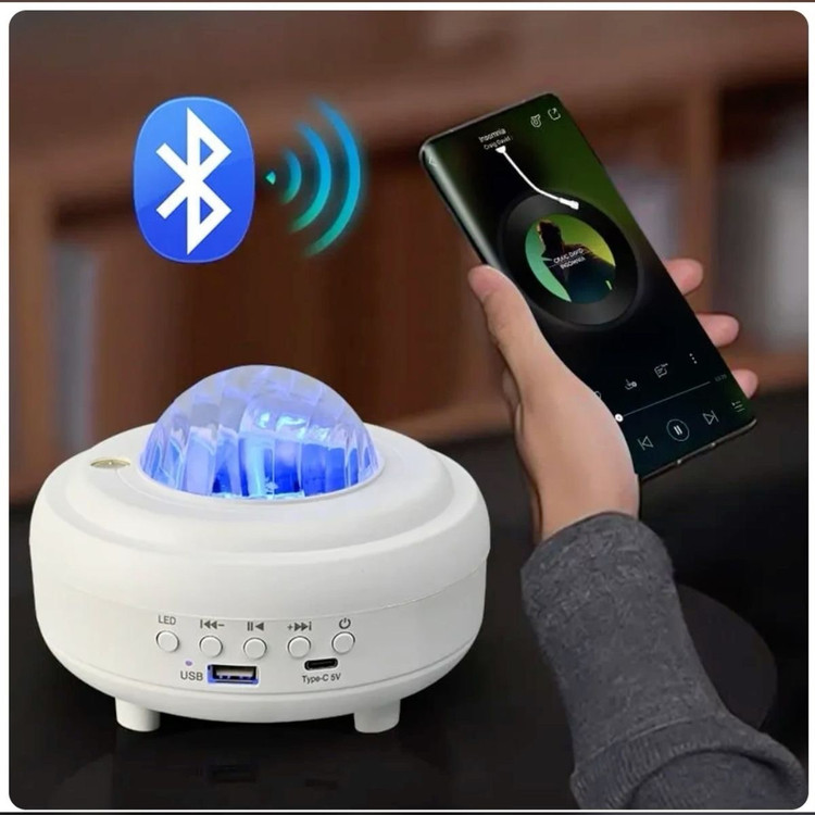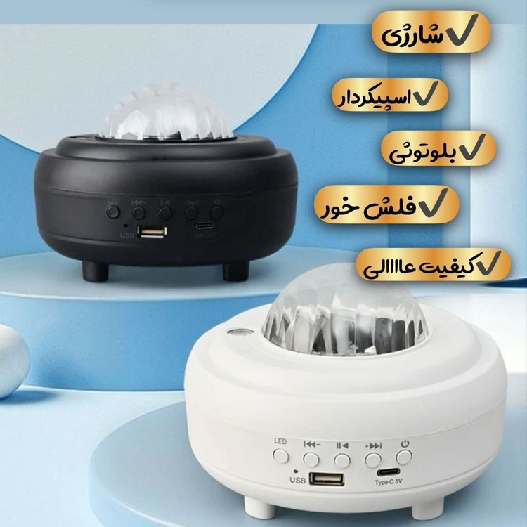 اگر به دنبال نورپردازی آرامبخش و زیبا برای سقف یا کف محیط های مختلف از جمله اتاق خواب ،اتاق گیم، بوتیک ، کافه ،گیم نت و.... هستید به شما این محصول را پیشنهاد میکنیم چراغ کهکشانی دارای نورهایی با رنگ های قرمز سبز ابی سفید و ترکیبی (تمامی رنگها 16 رنگ اصلی )که به دلخواه شما به صورت ثابت یا اتوماتیک وآرام عوض می شوند و زاویه تابش 360 درجه دارد که حالت نوردهی ان گردشی کاملا شبیه به شفق های قطبی است که نصبت به مدل های موجود در بازار جدید تر و زیبا تر می باشد دارای کابل شارژ type c یک متری درون جعبه ، دارای بلوتوث جهت اتصال به موبایل و پخش آهنگ یا حالت بلندگو و ورودی usb برای پخش اهنگ می باشد ولتاژ کاری دستگاه 5ولت که توسط شارژر موبایل کار میکند.