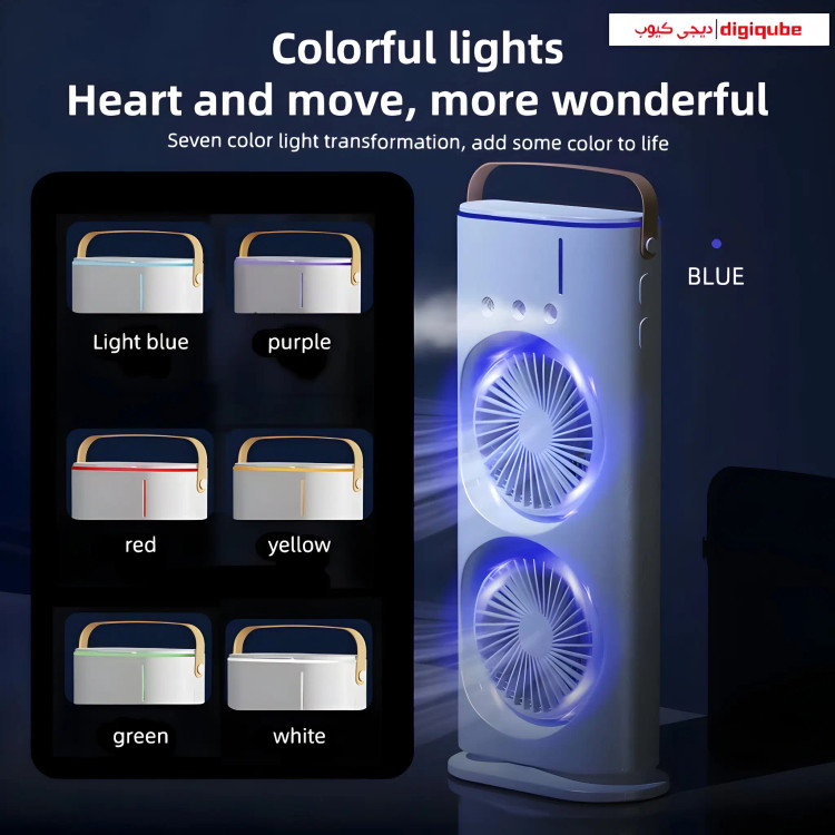 امکان تمیز کردن مخزن آب با یک پارچه مرطوب قابلیت چرخش 180درجه پرهها و تنظیم جهت باد _ امکان آروماتراپی و یا رایحه درمانی برای کاهش استرس، بهبود کیفیت خواب و مطبوع کردن فضا.با نگه داشتن دکمه فن چراغ های داخل فن روشن می شود.