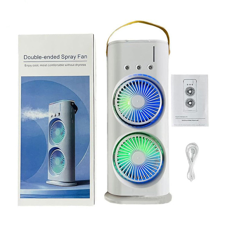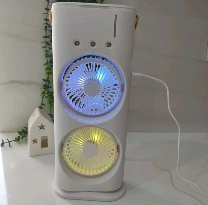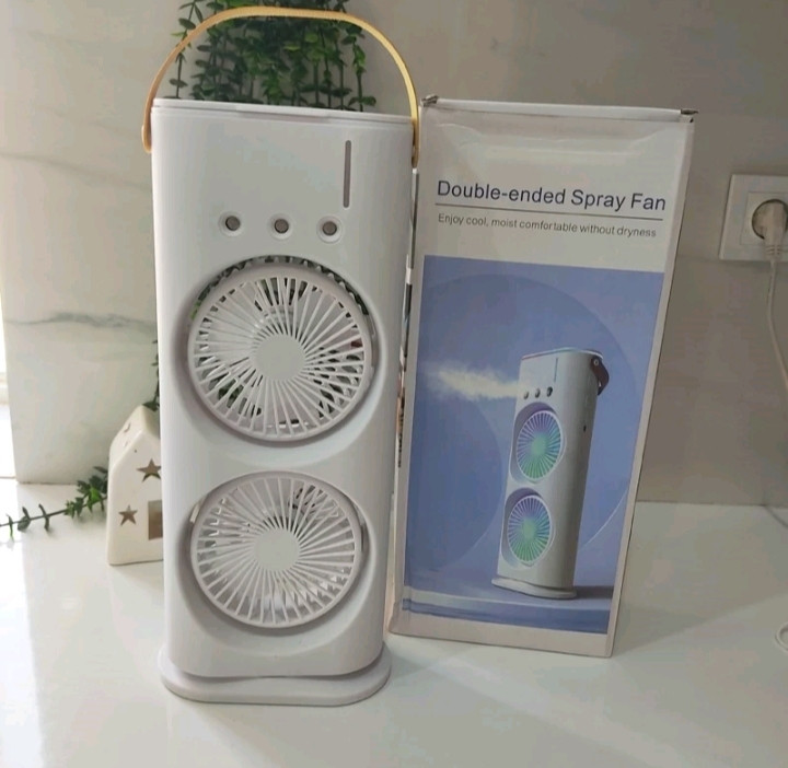 در سال 1404، محصول جدیدی با نام پنکه مه پاش رومیزی دو فنه وارد بازار شد. این محصول را با نام های پنکه مه پاش دو طبقه و پنکه مه پاش دوقلو نیز می شناسند که قابلیت شارژ دارد. در واقع همین محصولی که که در این صفحه قصد معرفی آن را داریم یک پنکه رومیزی بسیار قدرتمند است که از 2 فن 3 پر با قطر 10 سانتی متر ساخته شده است. اگر از بخش بالایی بخواهیم شروع کنیم باید به مخزن آب آن اشاره کنیم که 280 میلی لیتر ظرفیت دارد. بر روی بدنه این فن یک خط تعبیه شده تا میزان آب درون مخزن مشخص شود. درون این مخزن می توان ترکیبی از آب و یخ یا آب ریخت تا از 3 نازل تعبیه شده روی پنکه به صورت اسپری خارج شود و با ترکیب باد، خنکی بیشتری را به ارمغان بیاورد.
